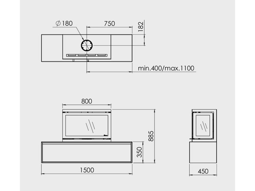 Triple je verzia s trojstranným presklením, Plateau je originálny priestor na odkladanie dreva: Straight (uzatvorený) dĺžky 150 cm. Interiér krbu je tvorený z vermikulitu v prírodnom sfarbení, ktorý akumuluje teplo. Krb sa dodáva so špeciálnym sklom odrážajúcim teplo, čo zvyšuje účinnosť krbu a znižuje potrebu čistenia skla.